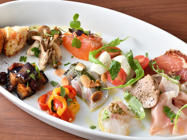 季節の食材を使った、色とりどりの前菜10~12種の盛り合わせです。一皿でテーブルを華やかに演出してくれるため、女子会にも最適。賑やかな見た目もまた楽しいメニューです。