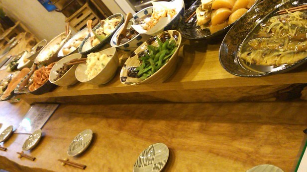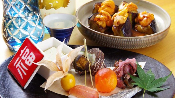 店内に足を踏み入れると目に飛び込んでくるのは、長い紅葉の一枚板のカウンターに載せられた大皿料理の数々。瀬戸内海で採れた真鯛、小イワシ、蛸、牡蠣など季節ごとの新鮮な魚介と、地元の生産者から仕入れた露地もの野菜を使い、素材の味を生かして作られています。特注の日本酒冷蔵庫には広島と中国・四国地方の地酒を中心に60銘柄、季節限定品も取り揃えています。創業以来70数年、毎日きちんと鰹出汁を取り、丁寧に下ごしらえをし、料理に手間をかけ続けてきたこだわりの味をご堪能ください。