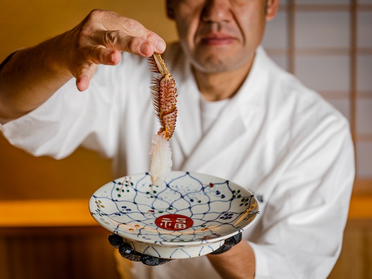 2023年2月、鮨と活け蟹料理が楽しめるハイブリッドな和食店がオープンしました。その名も【新富 きた福】。あの予約至難の活け蟹料理店【きた福】の3店舗目です。人気の活け蟹料理はもちろん、ここでは江戸前鮨も楽しめるとあっては食指も動こうというもの。店を任されたのはこの道32年の橋本料理長。鮨と和食の二刀流で腕を磨いてきたベテランです。毛蟹やタラバ蟹など旬の蟹を生きたまま目の前で捌き、刺身やしゃぶしゃぶ、焼き蟹とさまざまな料理法で楽しませる趣向に加え、鮪の握りや旬魚の押し鮨が所々で口直しとして登場。舌を飽きさせません。橋本料理長の軽快な会話とともに繰り広げられるカウンター越しのパフォーマンスもご馳走です。