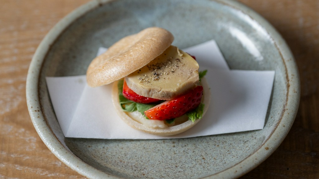 コースの前菜としても提供されている、可愛らしいサイズの最中。写真はフォアグラ・白花豆餡・苺の最中。季節によって異なる食材の組み合わせも楽しい逸品です。気軽に小さな旬を味わってみませんか。
