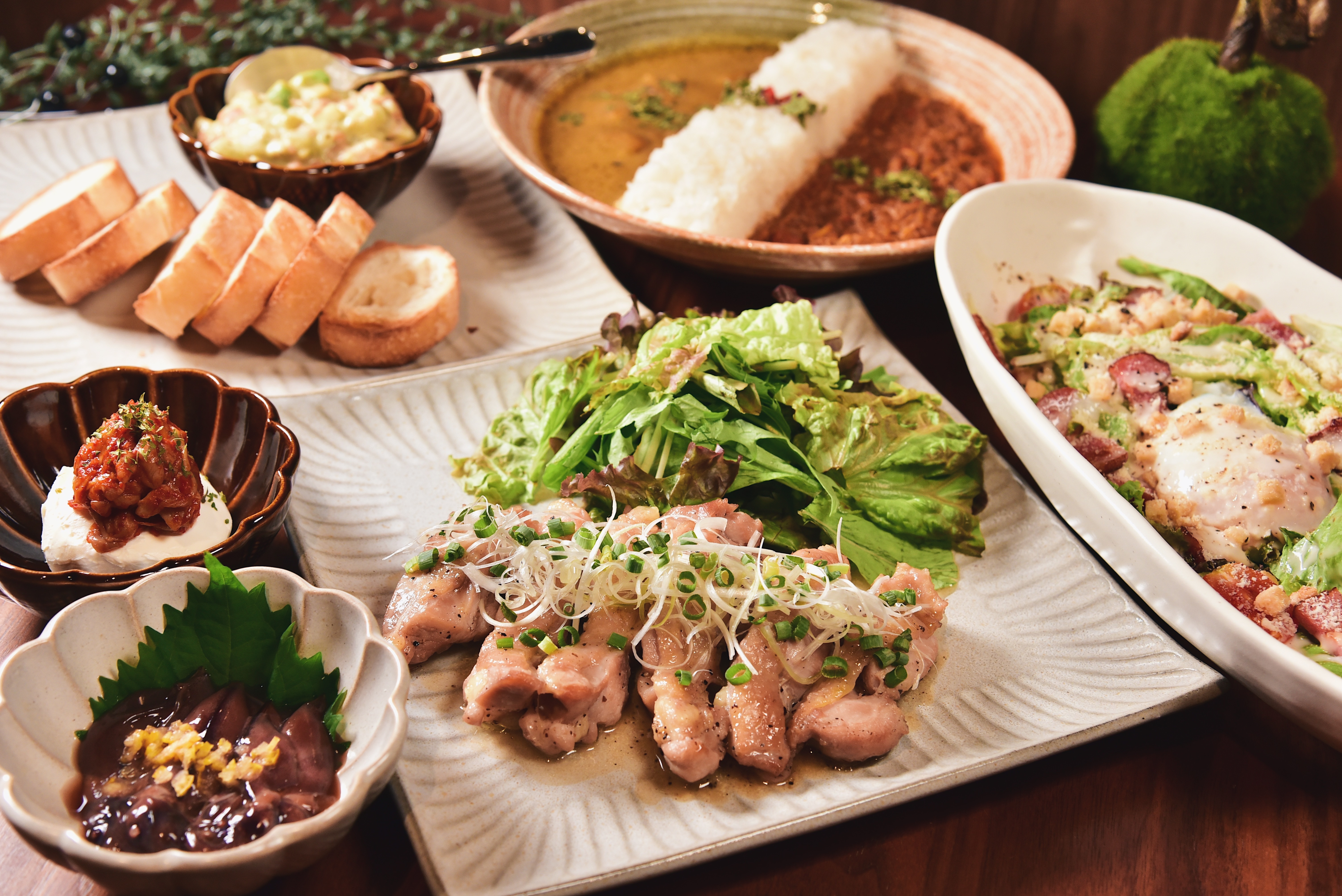 前菜3種、サラダ、肉料理にご飯ものは名物「薬膳カレー」を2種お楽しみいただけます。