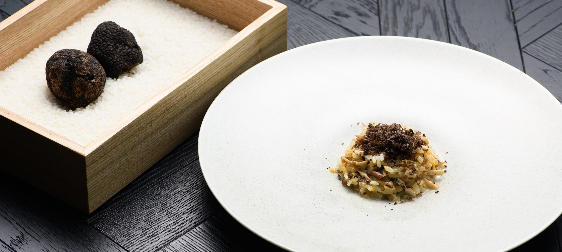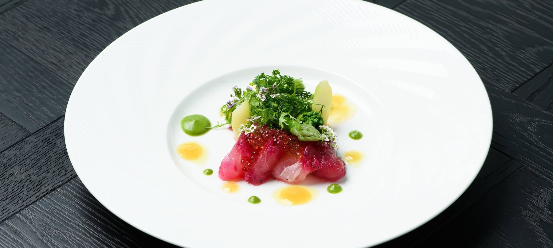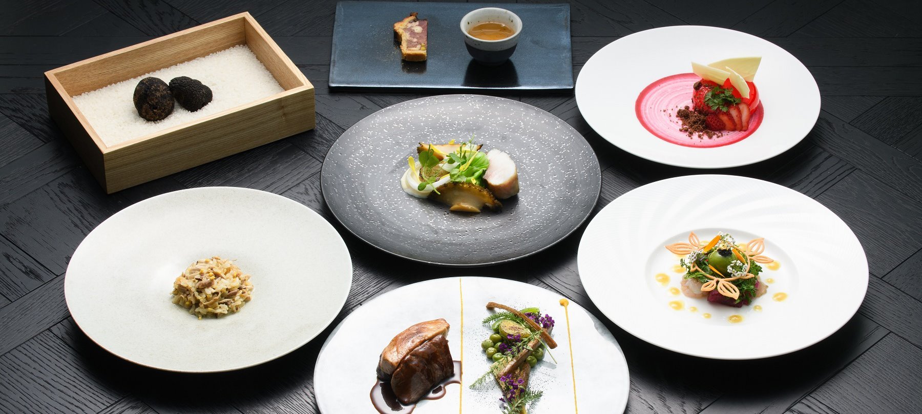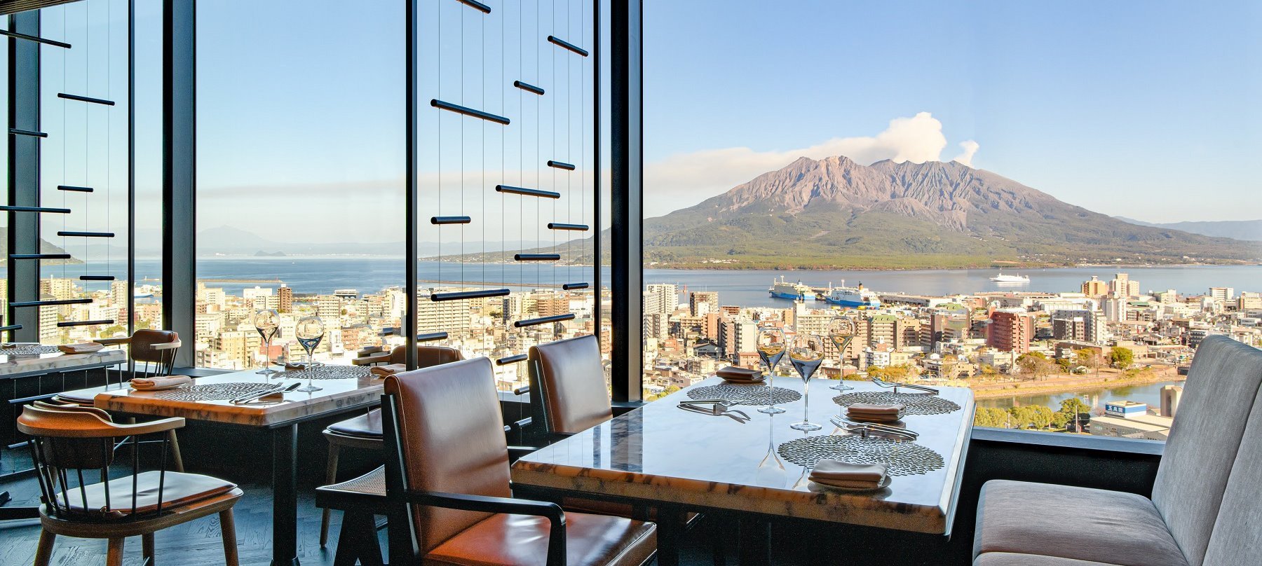ホテル最上階の特等席で味わうのは、鹿児島の豊かな自然が育んだ食材を一皿ずつ繊細に仕上げた料理の数々。味わい深い鹿児島県産黒豚や黒牛、地元でとれた野菜も薪火でグリルし、表面はカリっと香ばしく、中はふっくらジューシーに。薪窯から漂う焼き上がりの香ばしさと料理人の美しい所作に魅せられ、鹿児島の郷土を思わせる逸品を味わう贅沢なひとときは、忘れられない鹿児島の夜を鮮やかに彩ります。薩摩の伝統色である黒を基調にしたラグジュアリーな空間で、プレミアムな体験をお楽しみください。