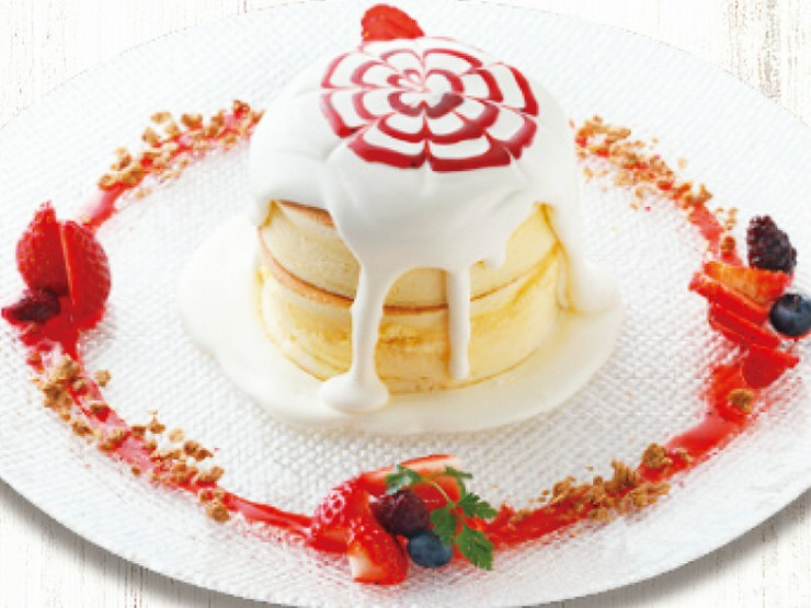 ふわっふわ食感をとことん追求したモスケオリジナルのパンケーキ。そのパンケーキに生クリームをたっぷりと掛けて、イチゴとベリーソースとハニーシロップで仕上げた一品です。SNS映えバツグンです。