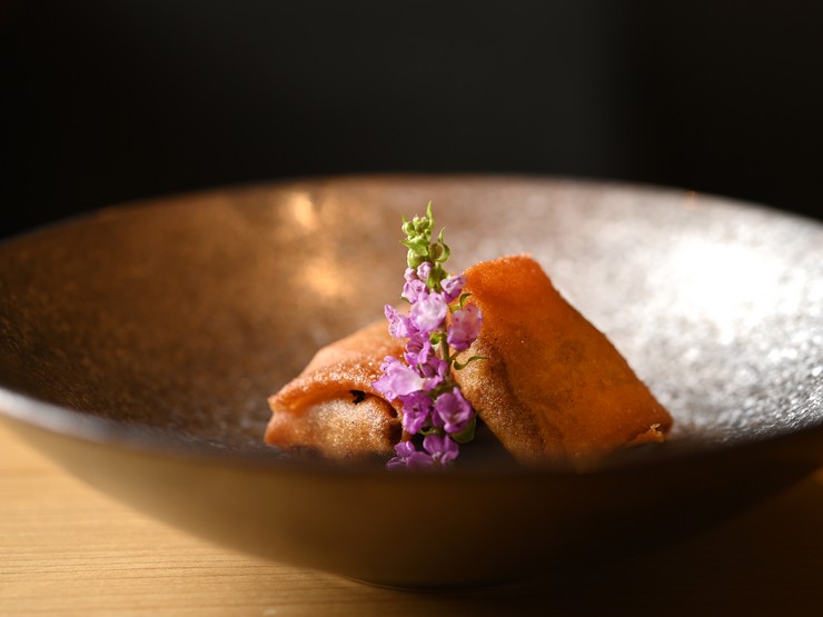 とろける食感が口いっぱいに広がる、濃厚な味わいが特徴の真鱈の白子(くもこ)を冷たいフライ仕立てに。白子に低温調理で火を入れた油に通さない冷製のフライです。とろけるような至福の味わいの逸品!