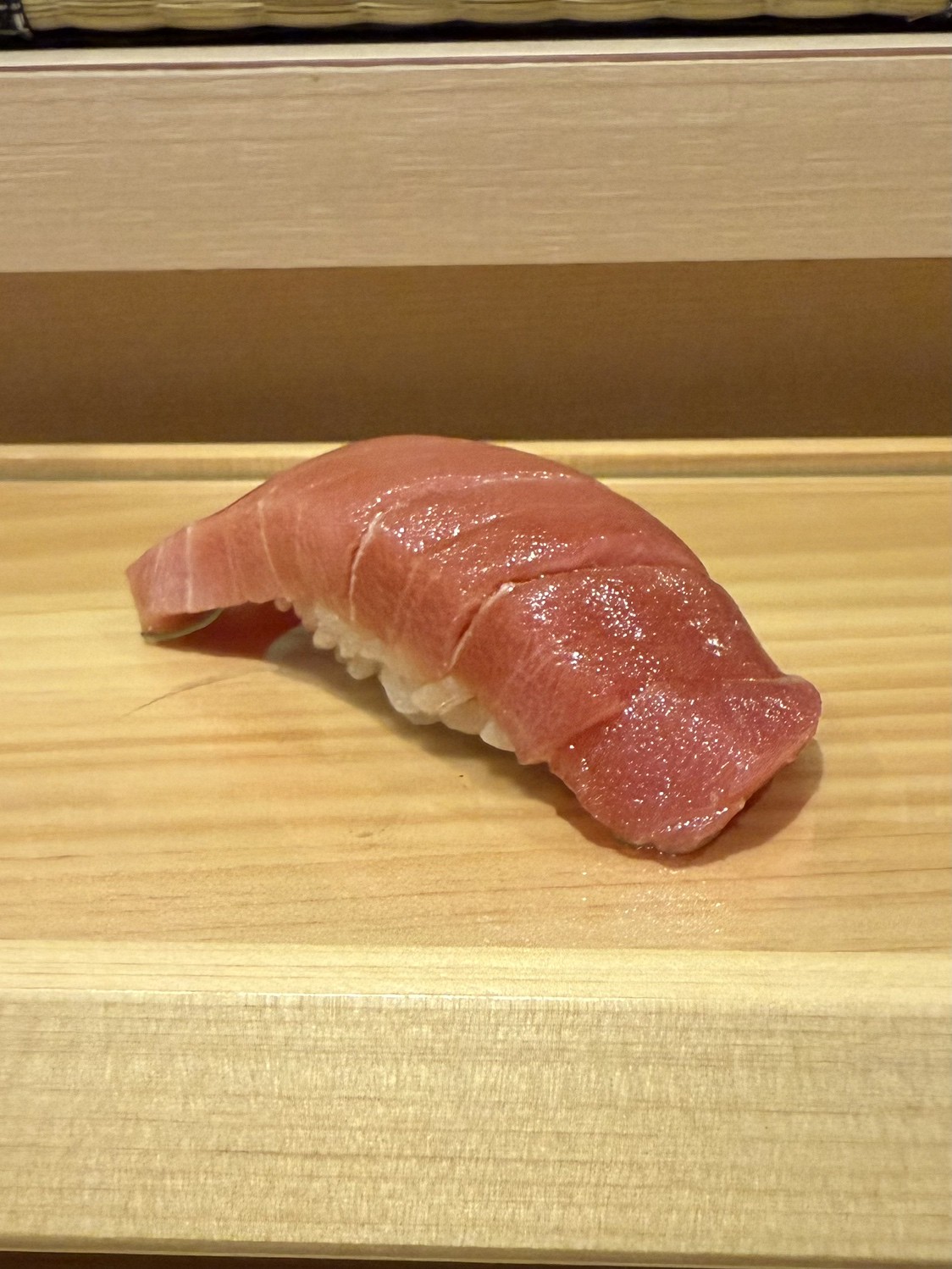 鮨の華・鮪の握りのおいしさは食通もうなる完成度の高さ。豊洲市場のマグロの専門仲卸から、その日最上の大間産天然本マグロを仕入れ、丁寧な仕込みをほどこして提供。赤酢をきかせたシャリとの相性も絶品です。