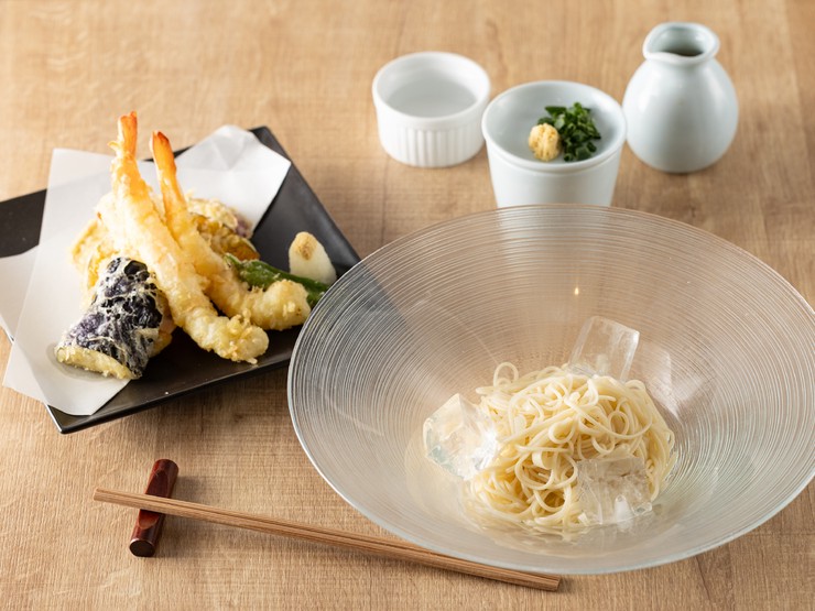 看板メニューである素麺は、独自のブレンドでつくられた自家製のつけ汁も自慢です。鰹節や昆布をベースにしただしの濃厚な味わいを堪能できます。写真は、定番メニューの『天ぷらのそうめん(冷)』。