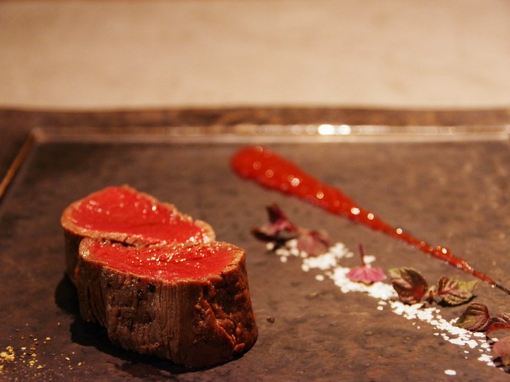 北海道産のELEZO社から仕入れる三歳の雌の蝦夷鹿は、熟練の技で半身から丁寧にさばかれ、特に内腿にこだわります。季節ごとに変わるソースや添え物で、訪れるたびに新しい味わいを楽しむことができる一品です。
