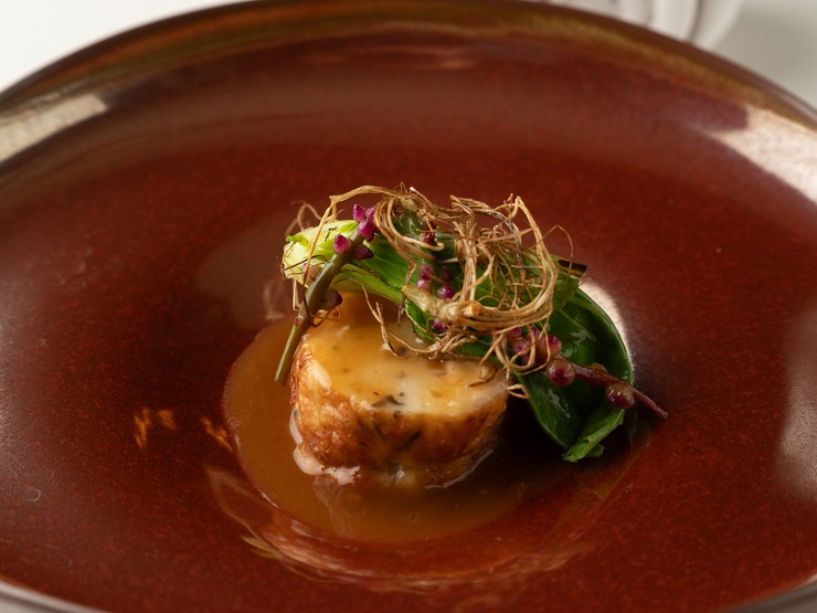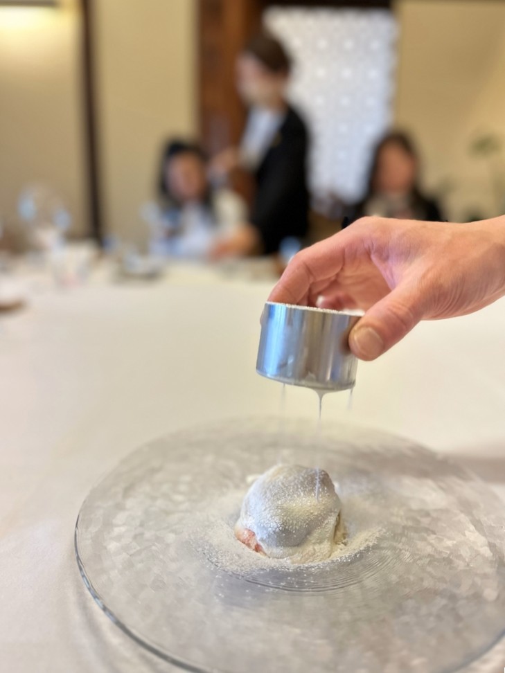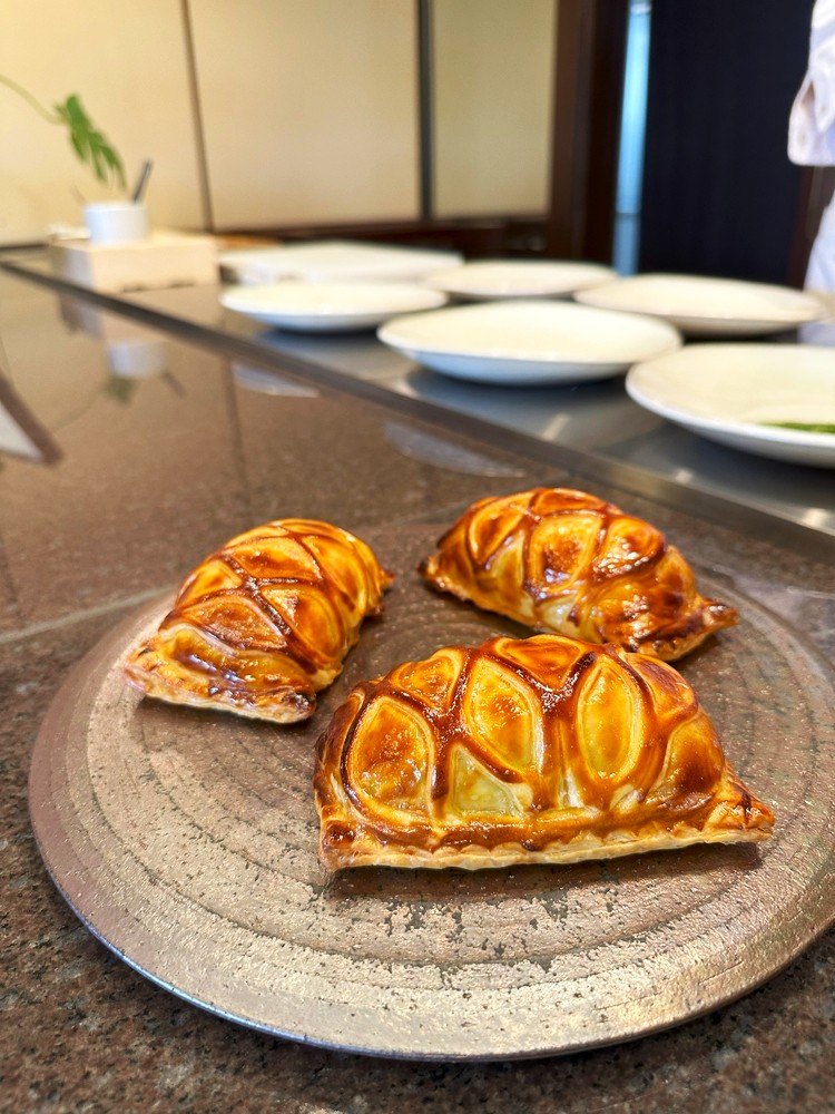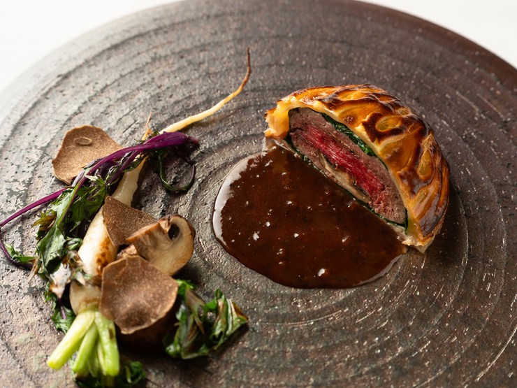 繁殖農家の経産牛が入った時のみ味わえる、フレンチの伝統的な料理『パイ包み』。コースによっては魚で提供されることも。サクッとした食感も楽しんで。(コース料理一例)