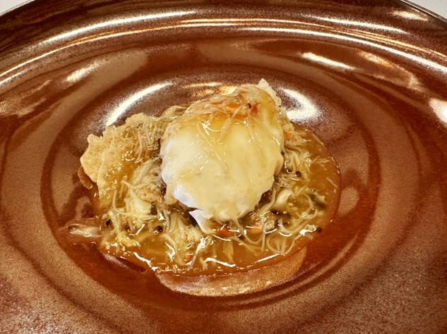 魚の旨みが凝縮された、スープ・ド・ポワゾン(スープ)を使った逸品です。近海の海を満喫できるような幸せを感じる一皿。(コース料理一例)