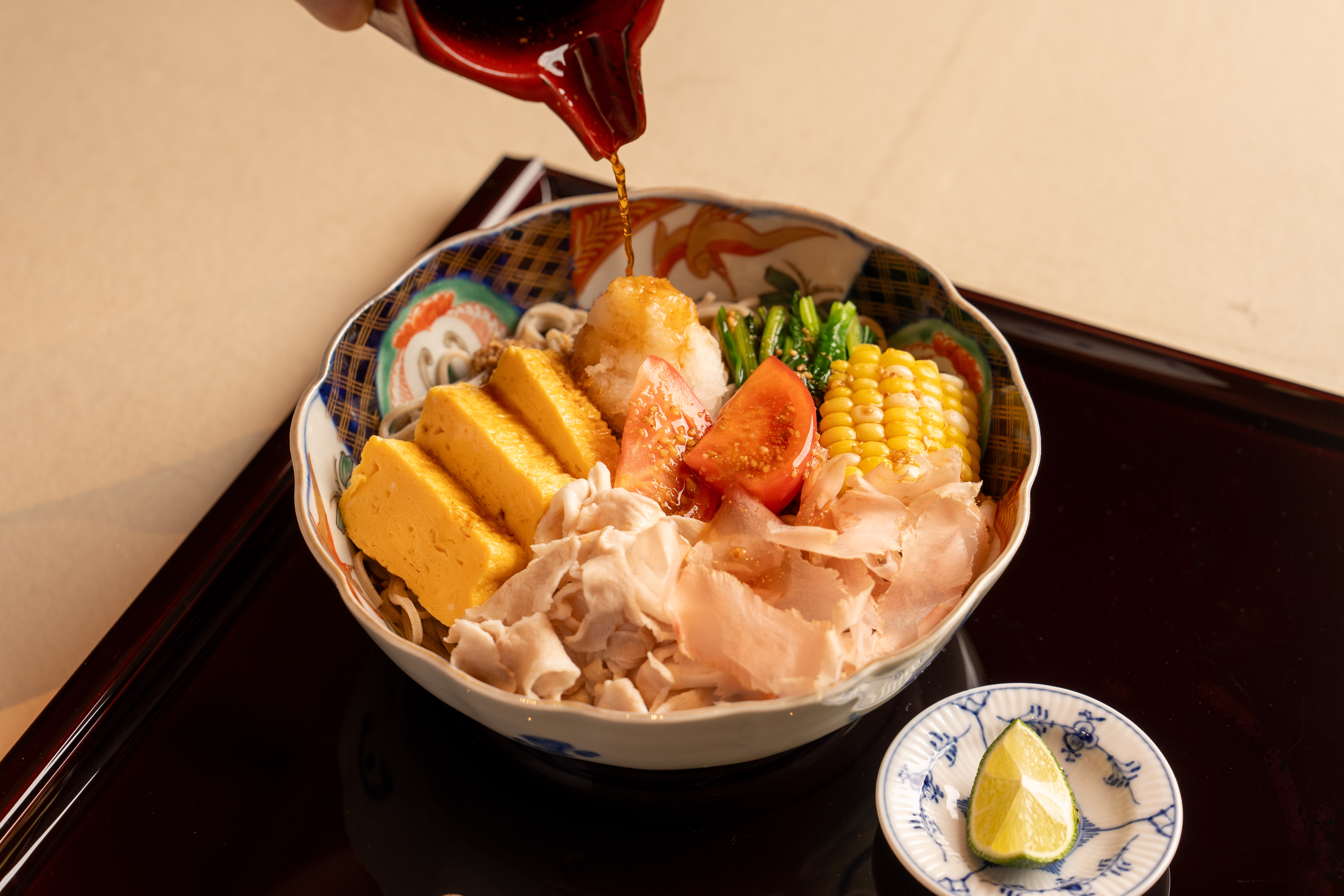アールのついた格天井、和紙のカウンターにジョージナカシマのニューチェア。滝のある庭園には錦鯉。日本のアイデンティティを意識しながらもラグジュアリーで刺激的な内装。カウンターにかかる8メートルの金箔画「親子虎と二羽兎の遊戯図」はエルメスやバカラなどのデザインを手掛ける河原シンスケ氏によるもの。朝は和朝食、昼はお蕎麦、夜は蕎麦懐石。おとなの雰囲気の中で味わう口福はまた一段と格別。これぞ醍醐味。