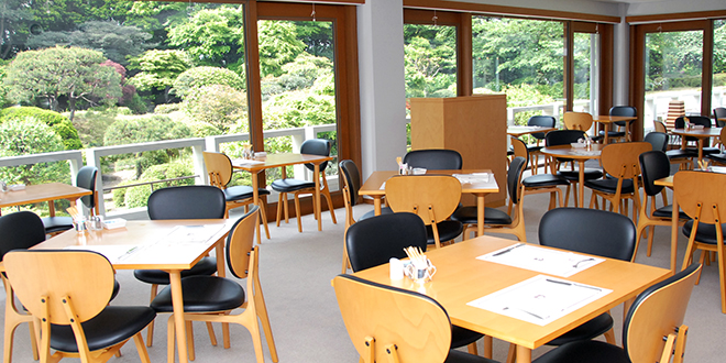緑豊かな風景と色鮮やかな料理に心地よさを感じられる、広々としたホテルのラウンジ