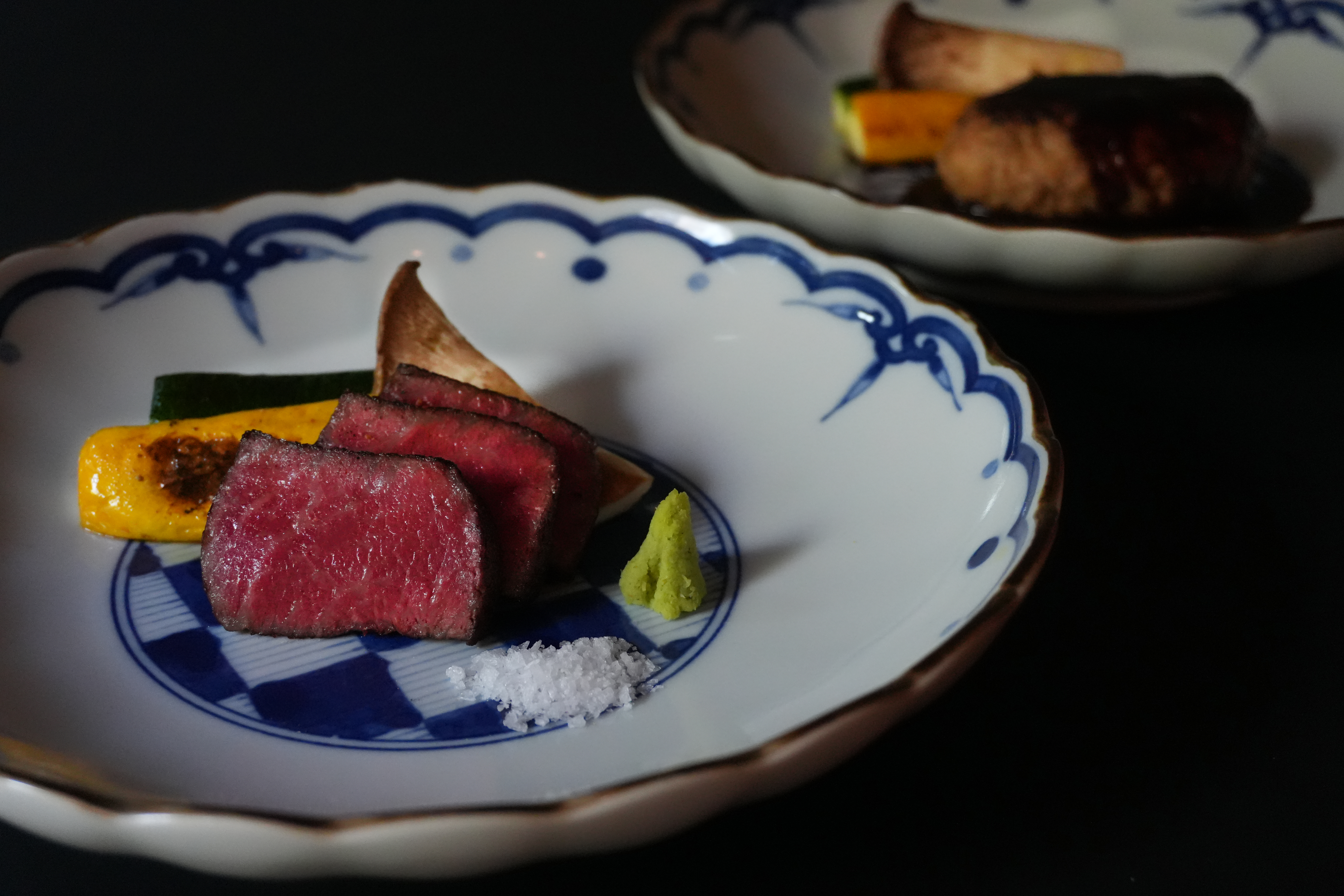 JR新宿駅東口。アパホテル東新宿歌舞伎町タワー1階にある本格的鉄板焼きレストランが【鉄板焼き 刃の下に心あり】。ディナーはコースのみで、毎日限定3組の完全予約制です。店内は、目の前に鉄板が見えるカウンター席・テーブル席・個室。間接照明を効果的に使い、落ち着ける雰囲気の中でゆっくりと食事を楽しむことができます。目玉となるのは、経験豊富な二人のシェフ。ダブルでパフォーマンスを披露してくれる、珍しいスタイルです。コースは3種類。それぞれA5ランク「松阪牛」をはじめとした国産牛が使われたステーキを中心に、季節の逸品が堪能できます。また、記念日デートには『お二人様セット』がオススメです。