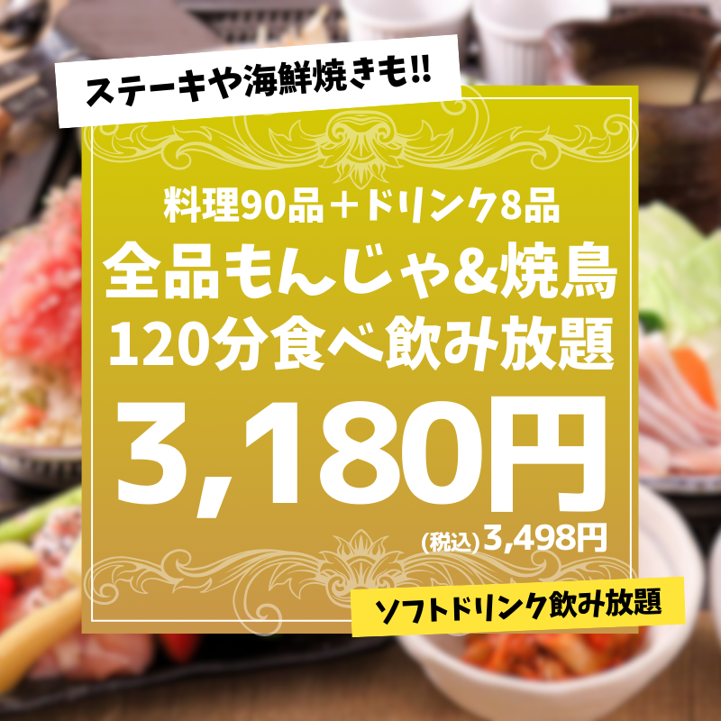 = もんじゃ×鉄板おつまみを楽しめる大衆酒場 = 王道から変わり種まで【25種以上の豊富なもんじゃ】が自慢! 40種以上のトッピングでカスタマイズも楽しめる♪(55円~) その他【鉄板or即出しおつまみ、今治焼鳥】などをご用意! お酒も【レモンサワー109円、ハイボール109円】の高コスパ☆ 友達との飲み会・会社宴会などにおすすめです! ■お酒と楽しむおつまみ ◇もんじゃ549円~! ◇鉄板439円~ ‥コーンバター、ポテサラなど ◇即出し385円~ ‥シラスおろし、たたききゅうりの梅和えなど ■気軽に立ち寄れる♪ ◇お通し料439円(税込)いただきます