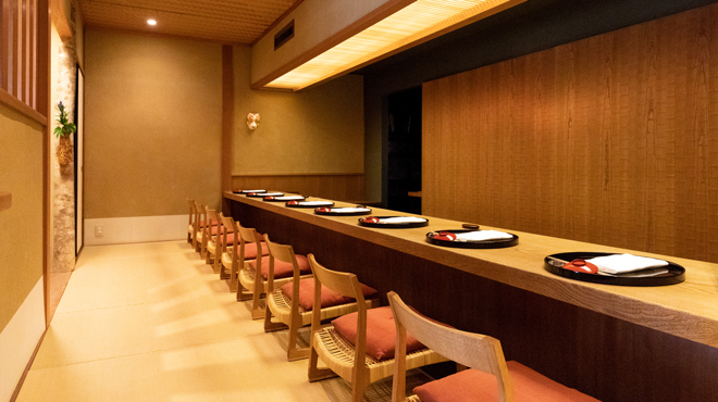 ジュッ、パチパチッ…小気味よい音を響かせる天ぷら。一つ揚がれば敷紙の上にそっと置き、また次を紅花油の中へ。目の前に座る客人の食べるタイミングに合わせながら、店主は天ぷらを揚げ続けています。【OIMATSU てんぷら 鈴木】は、コースが主体の天ぷら専門店。一品料理と天ぷらとを組み合わせ提供しています。白木のカウンター席には、朱塗りの盆をセッティング。色鮮やかな朱色が店全体を華やかに彩ります。一室のみの個室は厨房に隣接してつくられ、店主自ら天ぷらを提供しています。そのため、カウンター席同様揚げたての天ぷらを味わうことが可能。デートや接待、会食など特別な時間を大切な人と共有したいときに訪れたい一軒です。