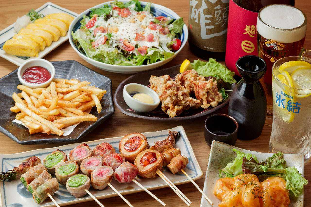 ◆新しい野菜巻き串専門店 新鮮野菜を豚バラで巻いた串は、彩り豊かで味わいも歯ごたえも爽やか! 定番の正統派から明太子などの変わり種まで種類豊富なメニューをご用意しており、いっぱい頼んでもヘルシーなのが最大の魅力となっております!当店自慢の野菜串巻き、肉巻き野菜、豚肉と新鮮野菜の最強タッグをぜひご堪能ください! ◆凍結サワー 当店の看板メニューでもある、凍結サワー!凍ったフルーツが乗っているサワーです!追いサワーもOK!また、各種ノンアルのご用意もございますので、お酒が飲めない方でも楽しんで頂けます ◆宴会コースあり 飲み放題付きのコース料理をご用意!野菜巻き串はもちろん一品料理も充実の内容♪
