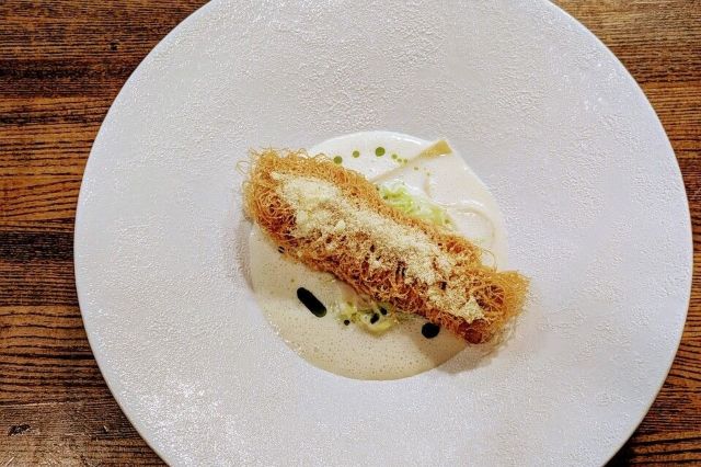 テーマは「心地良いちぐはぐ」。「木と石、不揃いの椅子、一部を和柄の壁紙にするなど相反するものでもバランス良くミックスすることで居心地が良くなる」とオーナーシェフの髙木和也さん。料理も然り。フォン(だし)を丁寧にとるなど伝統を大切にしつつ、独自に編み出した革新的な技法をプラスして食感や味わいで驚かせてくれます。また、レストランとビストロの2つの顔を持っているのも画期的。テーブル席は前菜500円~、メイン2,000円前後のアラカルトでカジュアルに、カウンターは完全予約制で髙木シェフの才能を余すところなく味わえるコースで提供。フレンチに馴染みがない人も行き慣れている人も、楽しませてくれる懐の深いお店です。