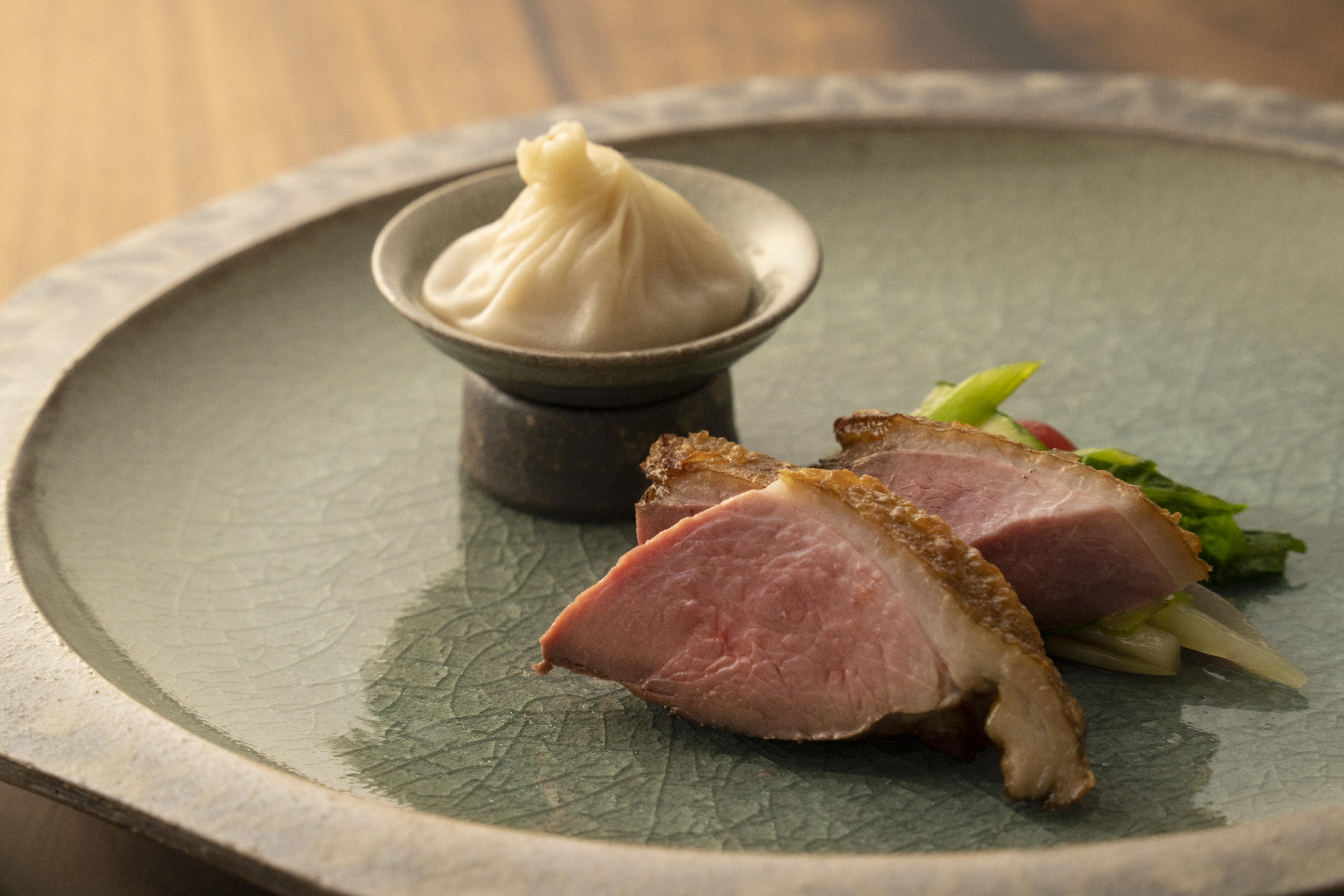 うぐいす色の野菜を美しく盛りつけた『新緑』という一皿。ルックスはフレンチ、湯葉や生麩といった食材は和食を連想します。いったい何料理? と評されることもありますが、店主の東浩司氏は即答で「中国料理です」。確かに、フレンチや和食の技法を使っていても、甜麺醤とフキノトウの味噌を包んで口に入れると紛れもない中国料理なのです。「消去法で中国料理、でいいんです」と東氏。常に心はパイオニア、中国料理を新たな段階に導くことが目標だとも。壮大な中国料理の体系を理解するからこその再構築。私たちはただ、料理の美味さに素直に驚き喜び、器や設え、どこかで「楽しかった」という記憶を残すだけでいいのです。