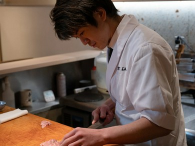 40年以上営業を続けたミナミから、2019年北新地へ店を移した【新明石鮓】。食材を丁寧に仕込み、だしを引き、飯を炊き、準備万端整えたあと暖簾が下げられます。「生まれ育った日本の食材を使った鮨を提供していきたい」という想いの元、鮨を握り続ける職人。オススメは、トロ5種とウニ3種を豪快に食べ比べできる「コース料理」。トロであれば、大間、長崎、塩釜、和歌山、インドなど。ウニであれば、淡路島、北海道、萩などから選ばれます。店で存在感を放つカウンター席は、樹齢300年を超えた桧の一枚板。そこに指先を洗うための綺麗な水が流れています。多くの著名人や常連客のみならず、様々な人たちが粒揃いの一貫を求め訪れる名店です。