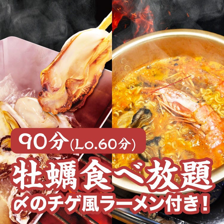 【90分(LO60分)牡蠣食べ放題】ラスト〆のラーメンに変更可能!殻付き牡蠣のがんがん焼きを思う存分堪能!
