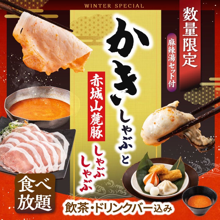 【期間限定!12/18~1/31】『かきしゃぶと赤城山麓豚しゃぶ食べ放題コース』+ドリンクバー付き!