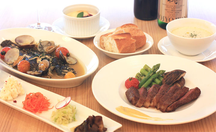 緑豊かな風景と色鮮やかな料理に心地よさを感じられる、広々としたホテルのラウンジ