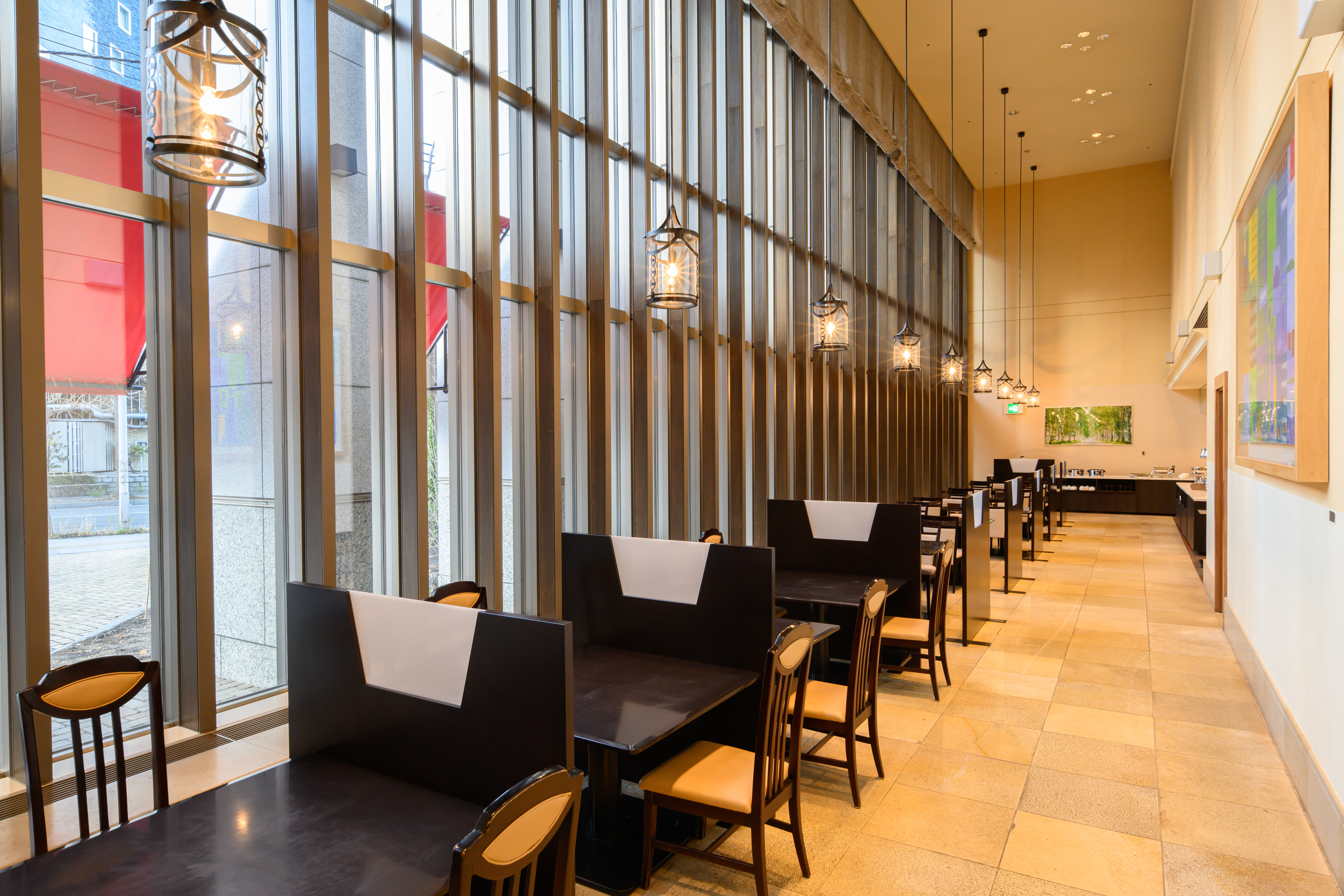 店内は落ち着いた雰囲気で、大きな窓から季節感を感じられる庭が眺められ、明るく開放的です。厳選した素材を使って、すべてに手を抜かない丁寧な料理は見た目の美しさも秀逸で、目でも口でも美味しく味わうことができます。シェフやパティシエが目の前で腕を奮う実演コーナーでは、できたてを楽しくお召し上がりください。多彩なパーティスタイルにおこたえするグラスシーズンズ。一流シェフのパフォーマンスでお届けする作りたて、できたての料理を、人数に応じた快適なパーティスペースでお楽しみいただけます。