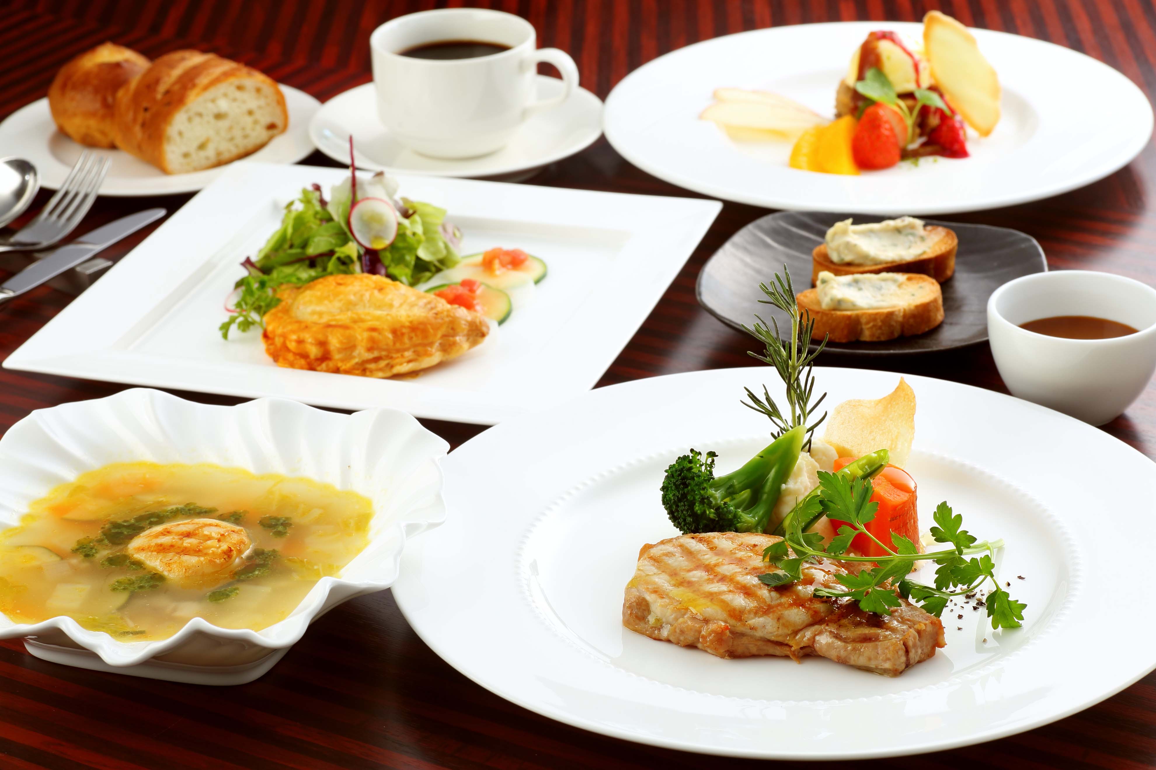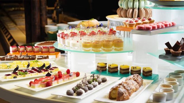 シェフが目の前で仕上げるメインディッシュ、ホテルパティシエが腕を振るうスイーツ。