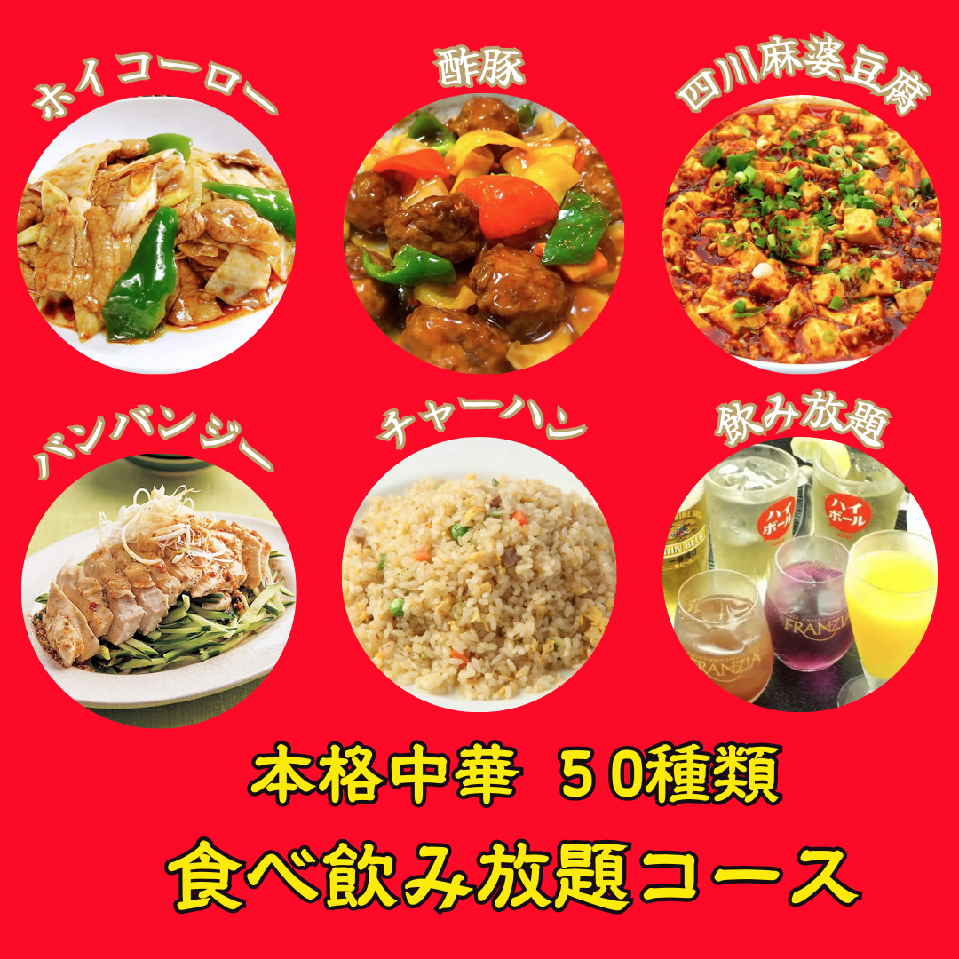 【ランチ】 月~金11:00~14:00 日替わりランチ880円~ 選べるランチや本格中華定食など多数ございます1 【宴会】 食べ飲み放題、飲み放題付コースなど、用途に合わせたプランございます。 ◆(月~木曜日)コスパ最強!本格中華全50種 食べ飲み放題プラン4980円 ◆(月~木曜日)餃子食べ放題&2時間飲み放題コース 3980円 【飲み会】 単品ご注文のお客様へおすすめ! 《120分単品飲み放題》アサヒスーパードライ生ビール付2H飲み放題 1980円 【デリバリー】 広島全エリア配達します宅配 デリバリー 出前 当日OK