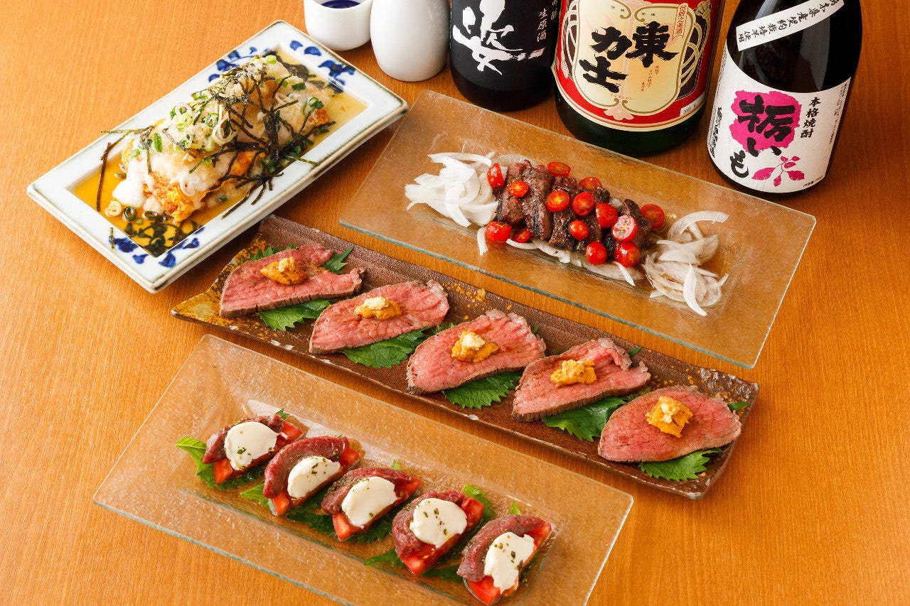 宇都宮駅東口徒歩3分、LRT東宿郷駅からは徒歩1分の好立地に佇む「大衆肉かっぽう にく源」。 一歩足を踏み入れると、そこは木を基調とした落ち着いた大人の空間。 ジャズが流れる中、全国から厳選した会津産馬肉の「極生馬刺し」や、名物「厚切り炙り牛タン」など、 高品質な肉料理をご堪能いただけます。 週末は深夜2時まで営業しております! 「極生馬刺し」には、全国でも屈指の品質を誇る会津産を使用。鮮度抜群の旨味と甘みをお楽しみください。 「厚切り炙り牛タン」はもちろん、肉寿司や逸品料理には日光高原牛やとちぎ和牛など、地元のブランド牛も積極的に採用しています。 「地産地消」を掲げ、サラダや焼き野菜には新鮮な栃木県産の野菜をふんだんに使用。肉の旨味を一層引き立てます。