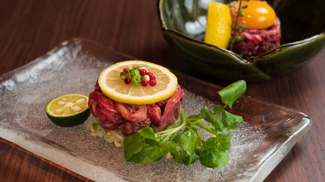 「休日にはよく鎌倉へ足を運ぶんですよ」。オーナーシェフの表成治さんがそう話すのは、この店の代名詞でもある野菜を探す食材リサーチのこと。それは“野菜のオーケストラ”と名付けたコース料理へのこだわりの現れでもあります。アミューズからデセールまで、全7皿で構成するこの店のコースには、何と約40種類の旬野菜が使われます。そして、ソテー、ポワレ、ムニエル、ブレゼといったさまざまな技法を駆使して、味や香り、風味、食感を計算し、ひと皿ひと皿にまとめ上げていきます。アミューズ後に登場する野菜のパフェは、およそ15種の野菜を取り入れたこの店のスペシャリテ。まさにオーケストラのごとき野菜のハーモニーが楽しめます。