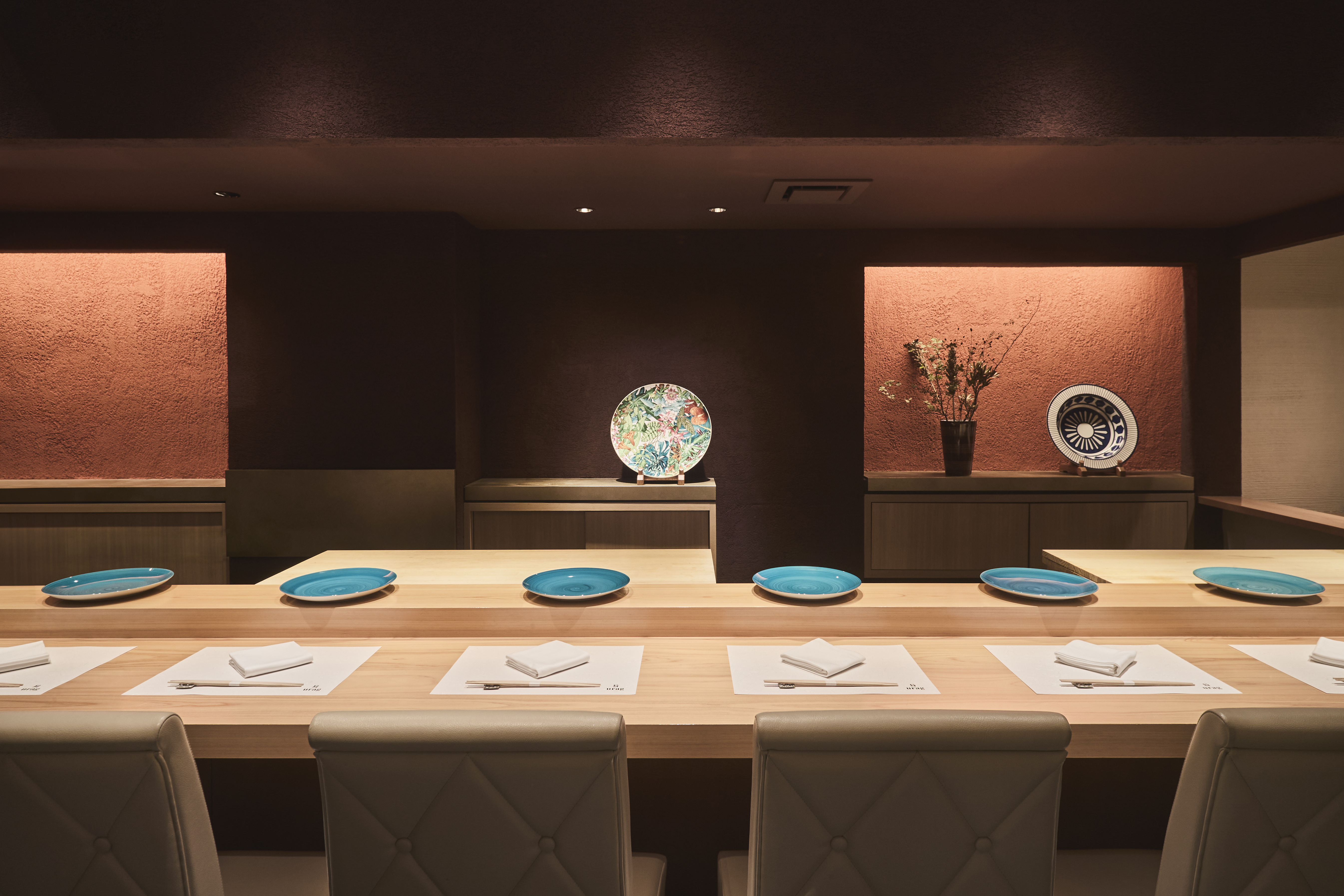 店内はカウンター7席のみ。それは、板場を仕切る職人の流れるような所作によって生まれた鮨を、じっくりと堪能できる席数に限るため。人肌程度に保たれたシャリは米一粒一粒が際立ちネタの旨味を引き出し、鮨としての輪郭が保たれています。メニューはおまかせのみとなり、その日仕入れた食材からつまみと鮨をテンポよく提供。檜の木目が美しい一枚板のカウンター席は、高さ、角度、厚みを計算しつくした特注品。鮨を握る手元を間近で望め、盛り付けた料理が美しく映えるように設計されています。店主の軽妙洒脱な話術によって、緊張が解きほぐされていく客人たち。ここぞという一軒にふさわしい場所であるということは間違いありません。