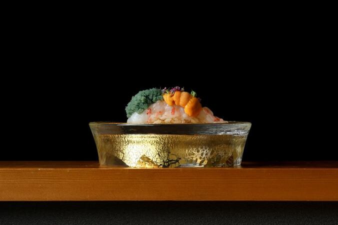 寿司を握る大将と和食を手掛ける料理長が腕を振るう【鮨 極】。舞台に見立てたカウンターで味わえるのは、起承転結を大切に構成された『鮨 極 会席コース』です。一切の妥協なく買い付けたネタを支えるシャリは、魚に合わせて変えるほどこだわり抜いたもの。『豚の角煮』や『月見餅の椀』など、コースの合間に呈される一品料理は和食の世界で研鑽を積んだ料理長が丁寧につくり上げています。季節の移り変わりと吟味した素材の味わいをゆっくり楽しめるのが魅力です。料理とのペアリングを考えセレクトされたワインが大切な人との時間に華を添えてくれます。他ではない隠れ家鮨店
