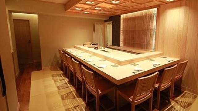 店内には会席料理のテーブル席に加え、白と黒の対比が斬新な寿司カウンターと大小3つの鉄板焼きカウンターを展開。さらに変化に富んだ意匠が施された、個性豊かな7部屋の個室とセミプライベートルームが設けられています。無垢材のフローリングと栃の木のツートンカラーで展開される美空間、寿司カウンターでは赤酢を用いてご用意する江戸前寿司や職人の感性が光る寿司会席などをお楽しみいただけます。