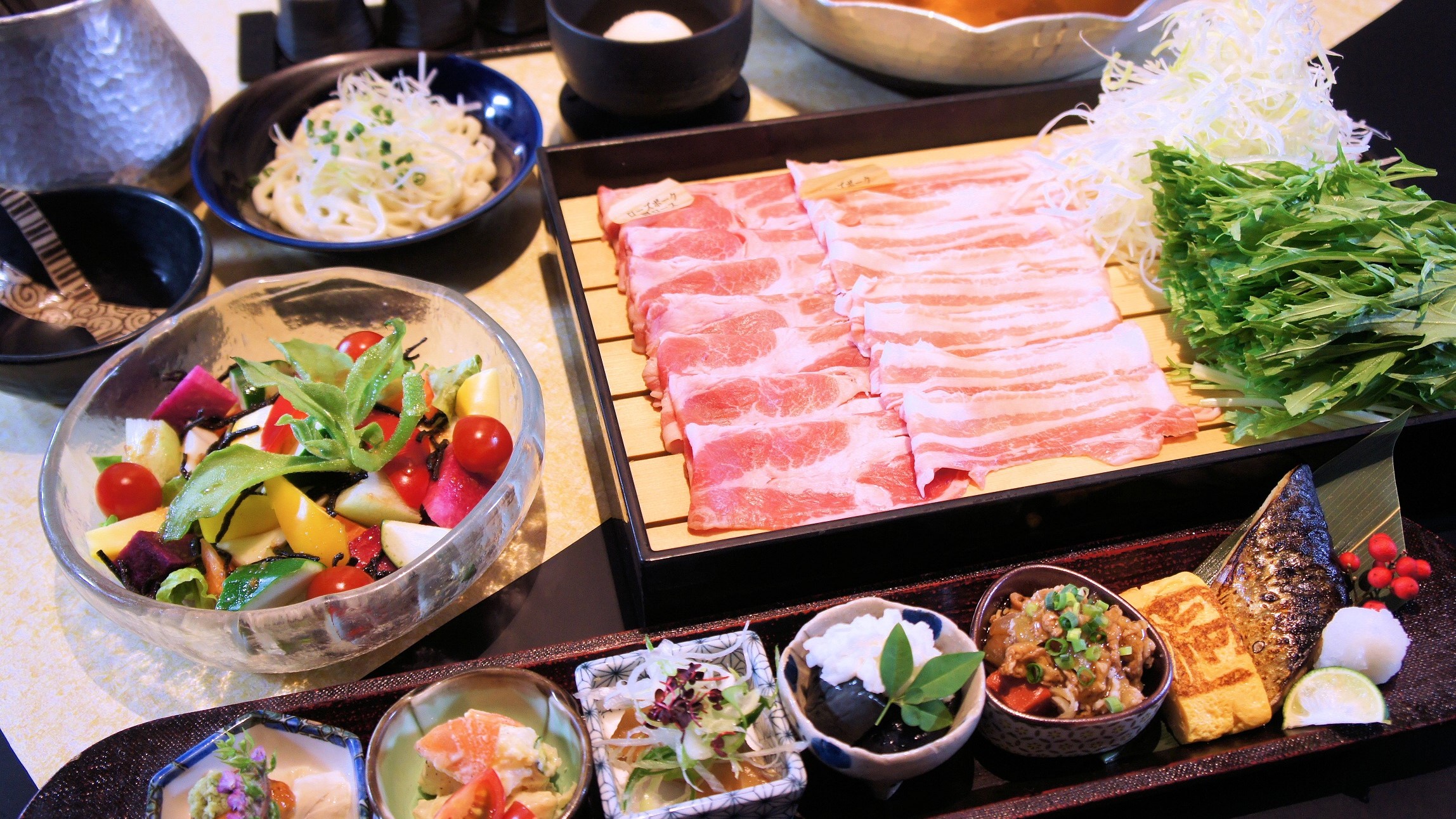 厳選した霜降り黒毛和牛や国産野菜、 9種から選べるおだし、お得な食べ飲み放題で至福の贅沢を。 掘りごたつ席完備の癒し空間で、楽しいひとときをどうぞ!