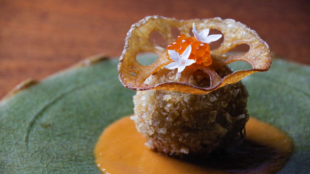 目立った看板は立てず、暖簾だけで客をいざなう【おもてなし きこう】。シンプルな佇まいとは裏腹に、提供される料理は一品ごとに艶やかで目を見張るものばかりです。食材選びに妥協は許さず、料理長自らが厳選した姫路の食材や瀬戸内海の魚介が使用されています。『あわびの天ぷら』は、噛むほどに広がる濃厚な甘みを実現していて好評。海と陸の幸を楽しめる『牛とウニのひとくちステーキ』も魅力的です。その丁寧な仕事ぶりは、「ミシュランガイド兵庫2016」掲載という結果にも表れています。ワインセラーを完備し、料理に合った美酒も満喫できるのが嬉しいところ。隠れ家のような静かな雰囲気の中、デートや接待など多様に利用できます。