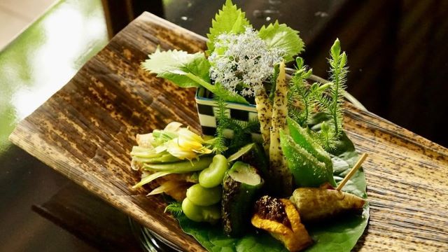 平安神宮の大鳥居から続く神宮道の坂を少し上り、歴史深い青蓮院門跡のほど近くで、2021年4月開店した【月おか】。大将は月岡正範。その名前を聞いてピン!と来る人も多いでしょう。そう、滋賀県・草津でランチの予約は2年先まで埋まっているという、人気店【滋味 康月】の初代大将その人です。店を譲り、日本の食文化を世界に広めたいとニューヨークに渡るも、コロナ禍のため断念。その熱き思いを胸に、開店したのがこのお店です。自ら野山に分け入り、畑に出向いて食材を調達。それらを丹精込めて料理する。器や食材一つ一つとっても日本には素晴らしい文化がある。そこには“馳走”という日本本来の食文化の姿を垣間見ることができます。