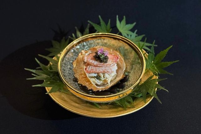 組子が美しい優雅な空間で、生け簀の新鮮な活ズワイ蟹とプレミアムな地酒を満喫
