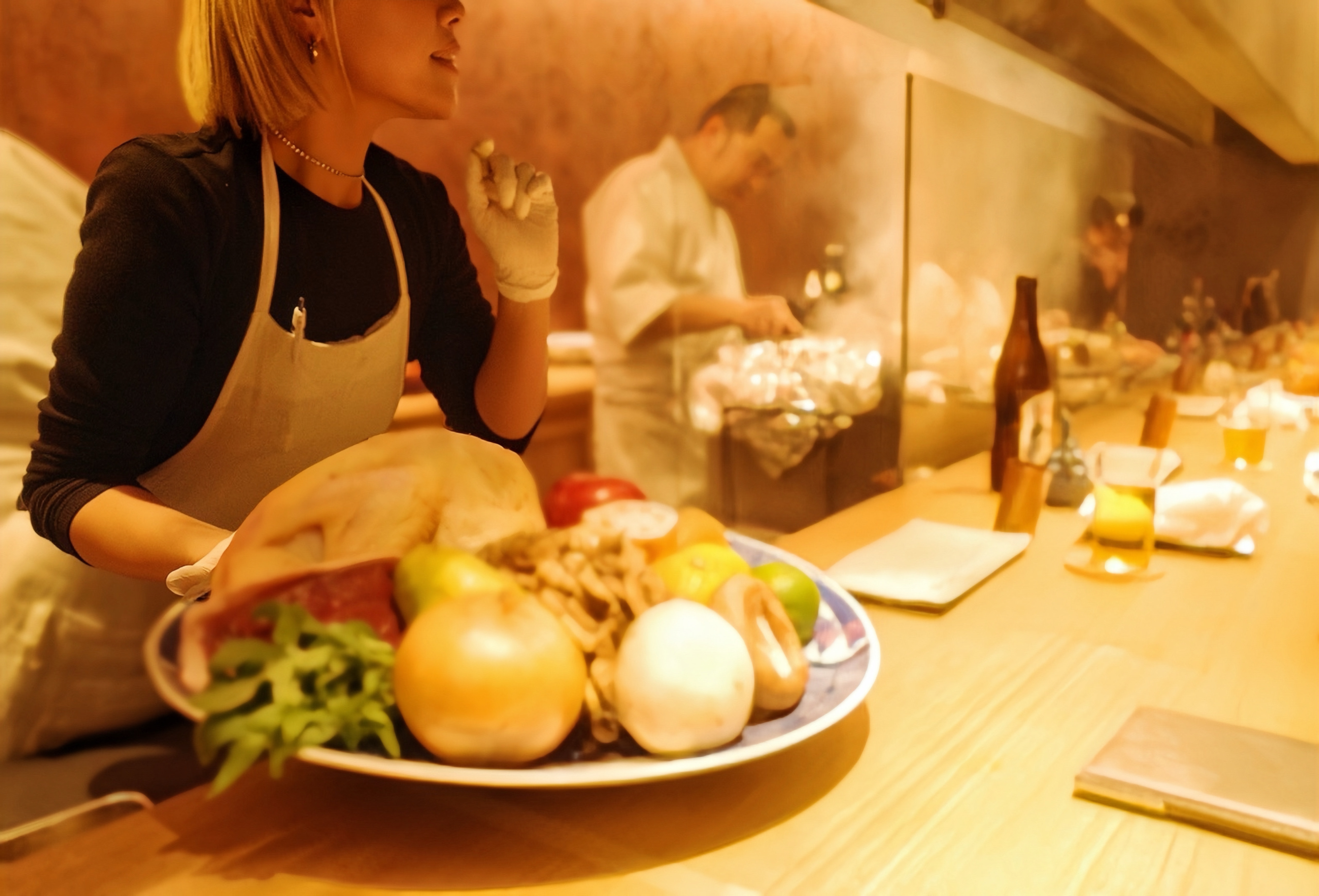 「幻の地鶏」と旬の食材を使ったコースを、ゆったりとしたカウンターで味わうひととき