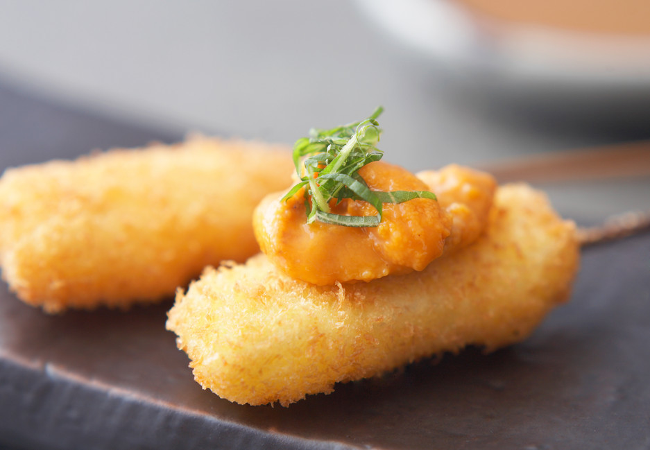 串カツ専門店縁日は大阪駅から徒歩で5分、東梅田駅からは徒歩で3分とアクセスの良い場所にあります。ビルの8階にあるお店はカウンター席を8席、テーブル席を16~18席をご用意、静かで落ち着いた雰囲気の店内です。一串ずつ丁寧に揚げられる串カツの種類は常時45種類、生でも食べられる新鮮な食材を使用しており、お客さん一人一人にソースなどの4種類の調味料を提供しています。また、お客さんの食事に合わせてタイミング良く串カツをお出ししておりますので、一品毎に食べ頃をお楽しみいただけます。