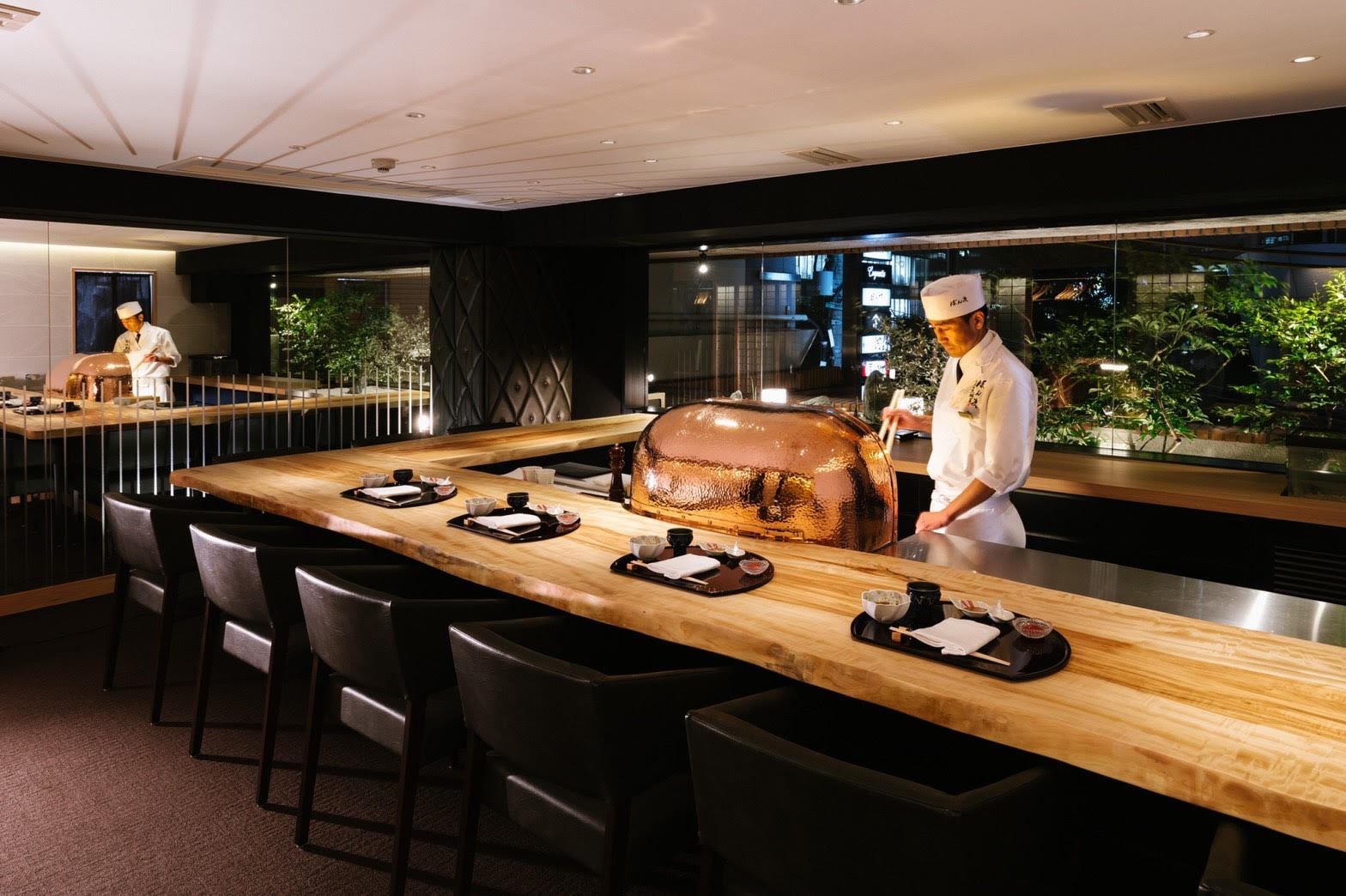 季節ごとに移ろう花々のように、料理や盛付け、器などで旬のおいしさを味わう【日本料理「花暦」】。伝統的な日本料理の技法を用いつつ、洋風の良さを取り入れた『フュージョンコース料理』がオススメです。アラカルトでもコースでも、魅力溢れる美味を満喫できます。個室が完備され、慶事や会食といったさまざまな場面で利用可能。店内は、落ち着いた木の風合いに包まれ、温かく心地よい空間が広がっています。檜の一枚板は、目の前で繰り広げられる、熟練の職人技を眺めながら食事を満喫できる人気席。京都の路地を思わせる趣きある石畳の小道や美しい日本庭園など、喧噪を忘れさせてくれる非日常がここにあります。