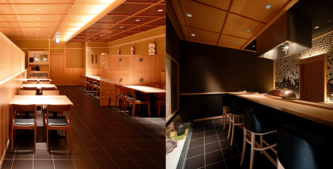 季節ごとに移ろう花々のように、料理や盛付け、器などで旬のおいしさを味わう【日本料理「花暦」】。伝統的な日本料理の技法を用いつつ、洋風の良さを取り入れた『フュージョンコース料理』がオススメです。アラカルトでもコースでも、魅力溢れる美味を満喫できます。個室が完備され、慶事や会食といったさまざまな場面で利用可能。店内は、落ち着いた木の風合いに包まれ、温かく心地よい空間が広がっています。檜の一枚板は、目の前で繰り広げられる、熟練の職人技を眺めながら食事を満喫できる人気席。京都の路地を思わせる趣きある石畳の小道や美しい日本庭園など、喧噪を忘れさせてくれる非日常がここにあります。