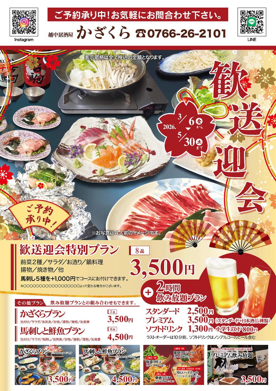 スタンダード2時間飲み放題がグレードUPしました。 2,200円(金麦)→2,500円(プレミアムモルツ、瓶ビール)に変更しました。 『馬刺しと鮮魚プラン+プレミアム飲み放題2h』8,000円が好評です。 プレミアム飲み放題2時間3,500円 純米酒以上の日本酒15種類以上ご用意。 日本酒ビギナーの方にもおすすめ。 熊本から直送する上質な馬肉と、 氷見漁港や新湊漁港から毎日仕入れる、朝獲れ海鮮が自慢!