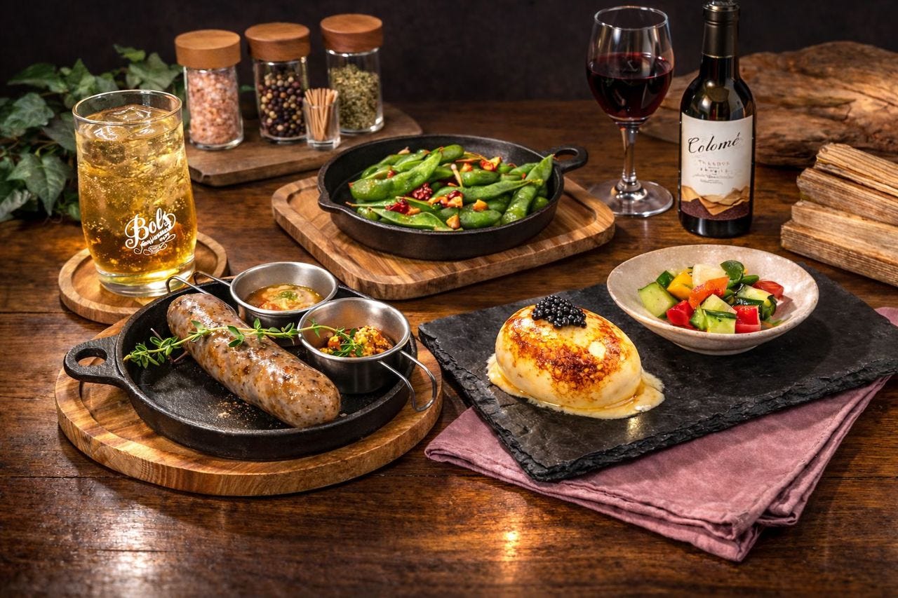 【薪火ちょいバル】ウフマヨキャビアと薪焼きソーセージ等気軽なバルセット4品+ドリンク2品