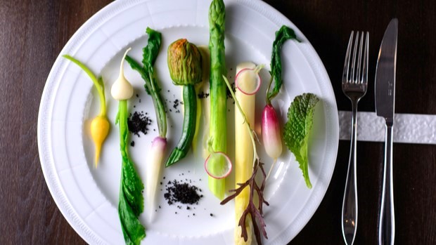 円山の閑静な住宅街に佇む【Restaurant MiYa-Vie】。「雅(みやび)」と、フランス語で「人生」「生き様」を表す言葉である“Vie”から名付けられ、そこで味わうことができる料理と共にシェフの思いが表現されています。レストランの顔とも言うべきロゴマークには、シェフの愛する野菜をモチーフにしたものを加え、曲線の部分は葉野菜と根野菜を意味し、ふたつの楕円は実野菜を意味しているのだとか。すべてのコース料理は季節の葉野菜・根野菜・実野菜を用いた前菜からスタート。北海道産の食材を主に使用し、繊細な和の食文化と調和したフレンチを堪能できます。
