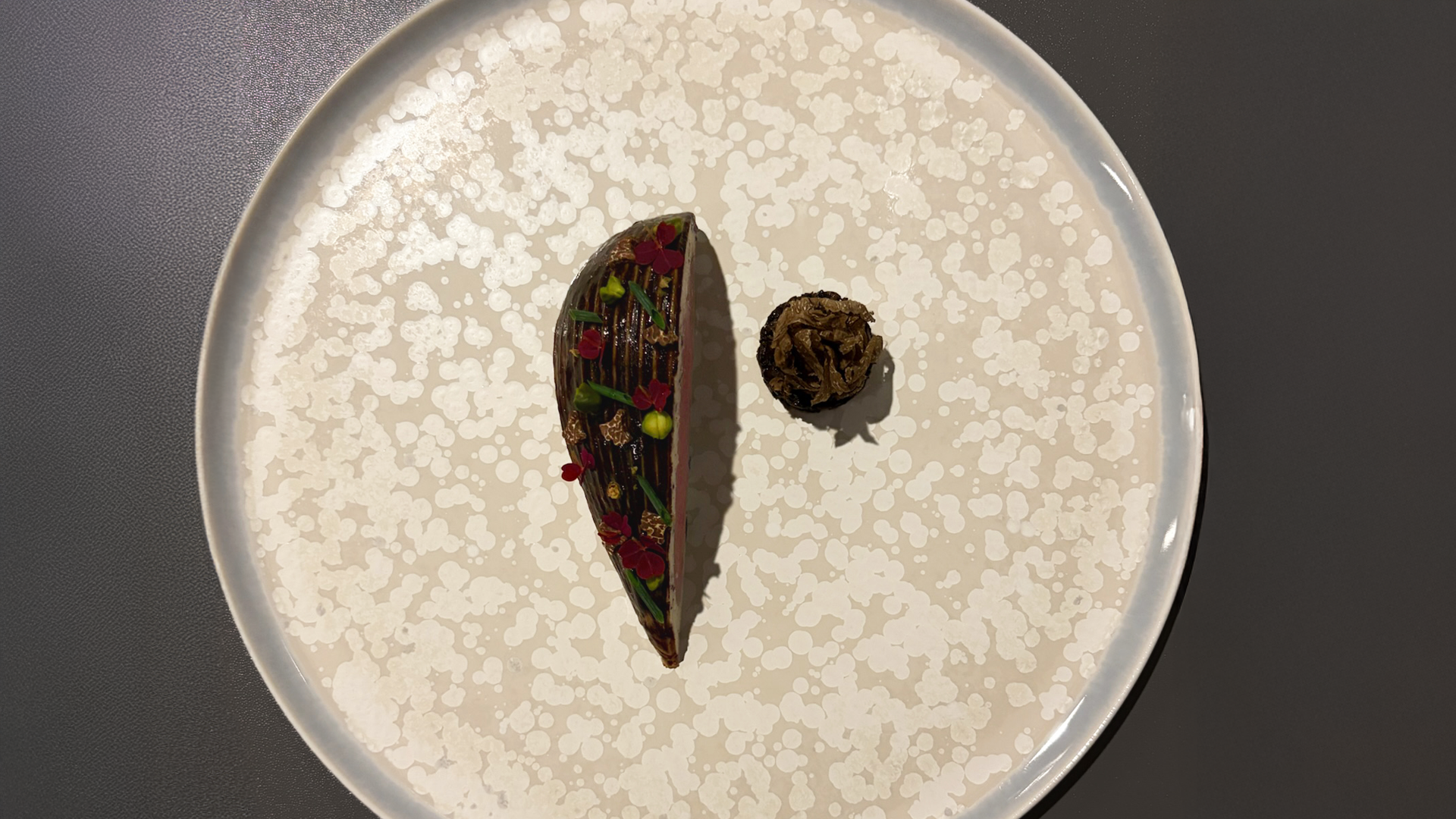 数寄屋建築の中村外二工務店の代表、中村義明氏がプロデュースした内・外観。ここにケヤキのパッチワークカウンターや、デンマークの家具メーカー「J.L. Moller」のチェアをあわせシンプルモダンな空間を構築するなど、オーナーシェフの青池氏が展開する“和洋折衷の融合美”には目を見張るものがあります。料理でいえば『農園野菜のプレッセ菜園仕立て』。京都産ほか20種近くの野菜を使ったこの一皿、ポテンシャル重視で余計な手を加えない食材の活かし方はまさに和食。一方で見た目や味わいはしっかりとフレンチに軸足を置いています。1階には氏が「割烹フレンチ」と称するカウンター席もあり。料理から内観まで見どころの多いお店です。