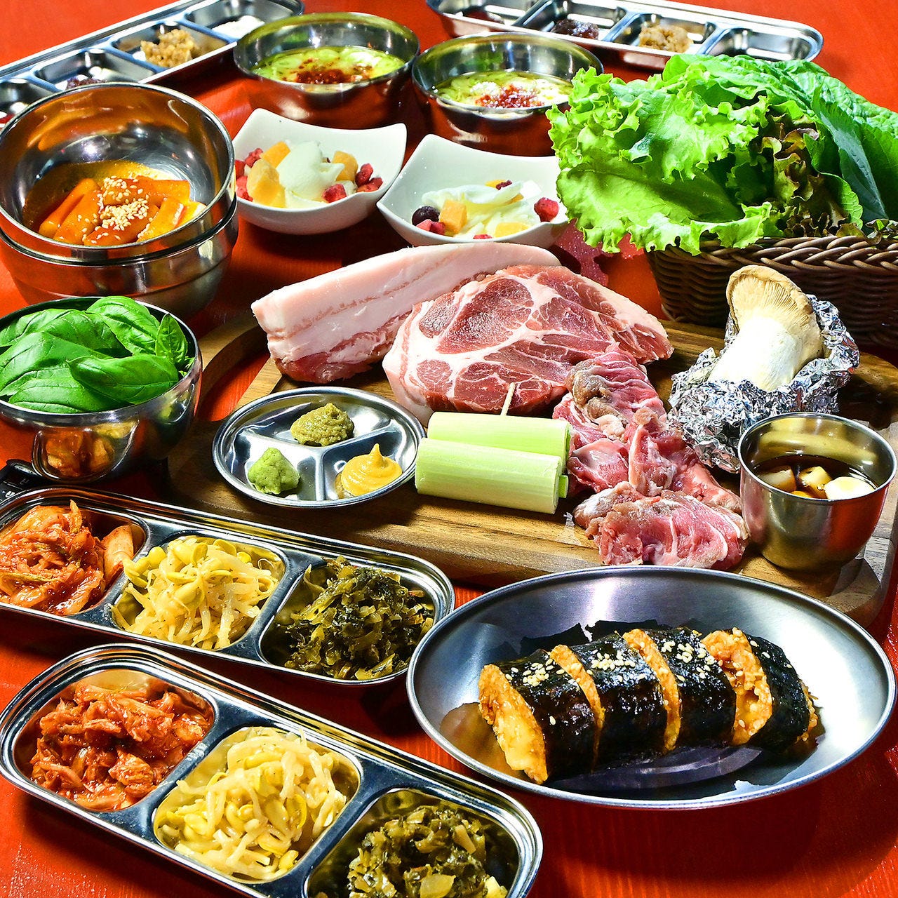 スタッフが目の前で豪快に焼き上げる「極厚黒豚」が自慢! その旨味を無限に引き立てるのは、甘酢ねぎだれ、香ばしいくるみ等、 9種類もの多彩な薬味とタレ。岩塩でシンプルに、辛味噌でピリッと。 自分好みの組み合わせを見つける楽しさも格別です。 風味豊かなバジルを巻く食べ方も◎ おすすめはぷりっぷりの海老をコク深い醤油でじっくり漬け込んだカンジャンセウ! タコ・ホルモン・エビの旨みを閉じ込めた韓国鍋「ナッコプセ」や、 とろ~りチーズがあふれる「爆弾キムチーズチジミ」も魅力。 瓶一本分を豪快にヤカンで楽しむマッコリと共に、会話も弾みます。 部屋ごとに壁紙が異なるデザインのスタイリッシュな店内は、 デートや女子会にぴったり。 奥には非日常的かつ癒しを感じられる森をイメージした個室があります。 ※大人数予約はお問い合わせください