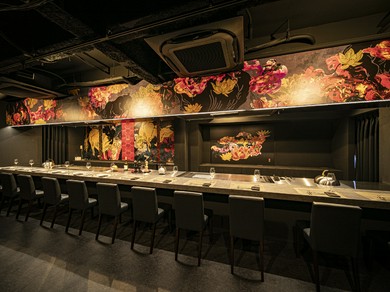 肉のプロが鋭い目利きで厳選する贅沢なA5ランクの黒毛和牛や国産牛。【心斎橋ステーキ】では鉄板焼で秀逸な牛肉を食べ放題で楽しめます。華麗なパフォーマンスで焼き上げる鉄板ステーキは柔らかく、噛むほどに旨みを感じる看板メニュー。さらに、新鮮な野菜やローストビーフ、牛すじ、パンや土鍋で炊きあげたご飯といったメニューも食べ放題に含まれています。店内は黒を基調としたシックで落ち着きのある空間で、臨場感溢れるオープンカウンター席のみ。シェフの背後には蒔絵のような美しい壁画が描かれています。デートや接待、記念日、女子会といった特別な日の食事会にお誂え向きです。