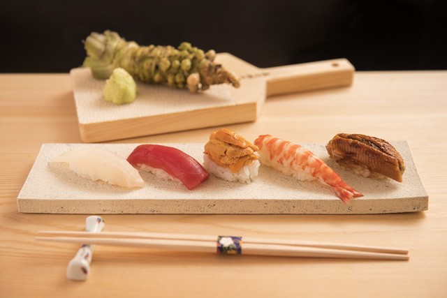 日本全国からお酒好きが集う【Sake Bar ACTA】。幻の日本酒「十四代」や「新政No.6 X-type DIRECT PATH」など、オーナー・廣瀬長七氏こだわりの日本酒を楽しめるお店です。日本各地の上質な魚介を使った鮨と日本酒によるマリアージュが自慢。落ち着いた雰囲気ただよう店内には、カウンター席が8つ用意されています。ゆったりとくつろぎながら過ごせる居心地のいい空間で、“お一人様”を満喫するゲストも珍しくありません。デートや接待利用などにも最適です。メニュー表はなく、予算に合わせて選べるおまかせコースのみで提供。どれを食しても納得のおいしさで、きっと心も体も満足できるはずです。