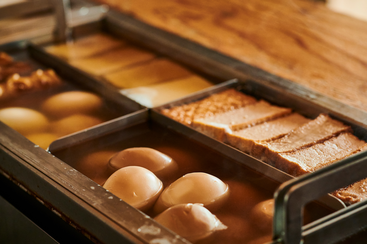 地下鉄南北線さっぽろ駅の8番出口より徒歩1分、地元で愛される居酒屋【やきとり・おでん 然】。ここは昭和レトロと現代モダンがミックスしたような、新しさと懐かしさが融合した不思議な空間で、お酒や料理が堪能できるお店です。毎日継ぎ足す濃いダシとサバ節と利尻昆布で取った薄いダシを混ぜてつくる汁に、大根やちくわなどを入れてじっくり煮込んだ『おでん』や炭火で焼き上げた『焼鳥』をはじめ、水分調整が難しい『ずわいの天ぷら』や北海道では定番の『ザンギ』といった定番料理から、浅野料理長のオリジナリティあふれる創作料理までが幅広く並びます。地場産の銘酒も40種ご用意! ゆっくりとお楽しみください。