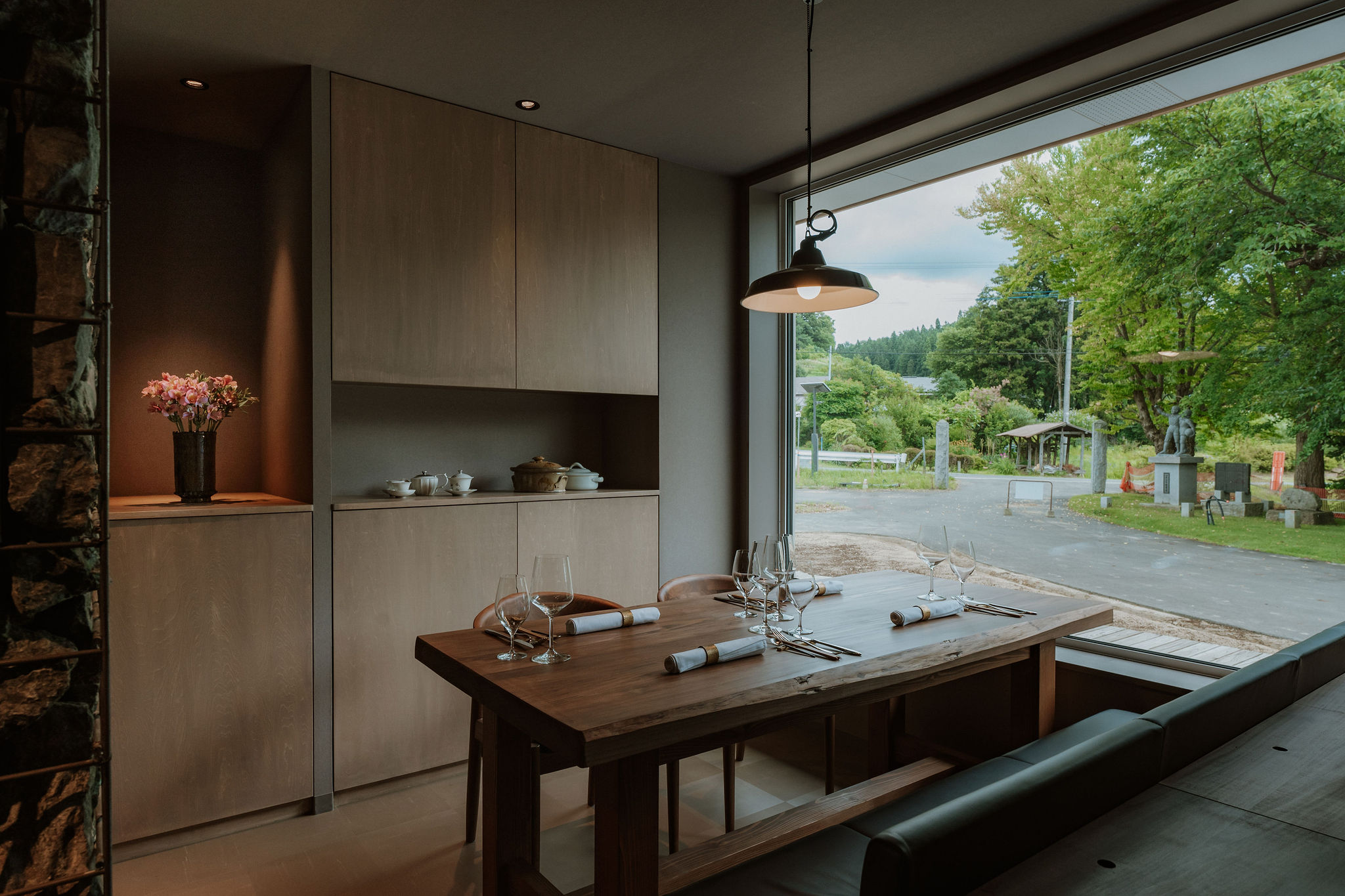 岩手県産の食材と郷土料理の要素を取り入れる事を常に意識しているという鹿澤氏。岩手県を訪れないと味わえない料理、そこにゲストが訪れる意味こそが、【Ristorante SHIKAZAWA】が追い続けるテーマです。ジオラマ、パノラマ、伝統的、温度、コースを構成する繊細かつ大胆な料理の一つ一つが驚きに満ちています。岩手県産食材とのペアリングを楽しめるワイン、ノンアルコールドリンクの品揃えも魅力。料理に合わせてソムリエがセレクトしたワインが食材の個性を引き出します。漆喰に炭を混ぜた、深いグレーの壁と紺碧のクロス、非日常を感じる空間で料理を堪能するひとときに、感性が研ぎ澄まされます。